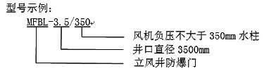 立風井防爆門按風機負壓分為不大于350mm水柱和不大于450mm水柱兩大類,按井口直徑有3個規(guī)格,共有6個型號規(guī)格,見下表: