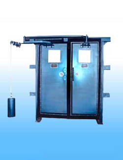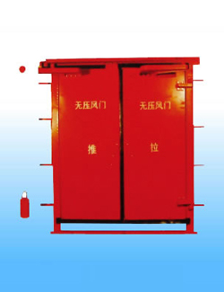 本手動(dòng)無(wú)壓風(fēng)門(mén)由門(mén)框、門(mén)扇、平衡機(jī)構(gòu)及配重等部分組成。